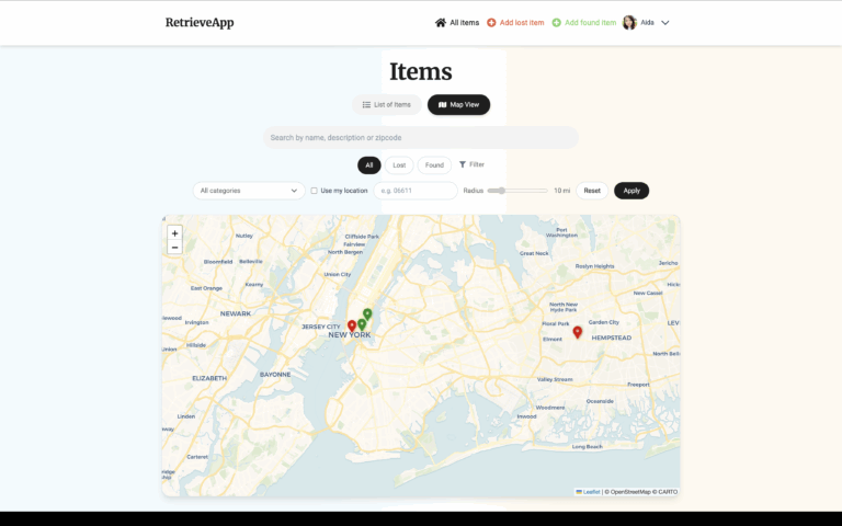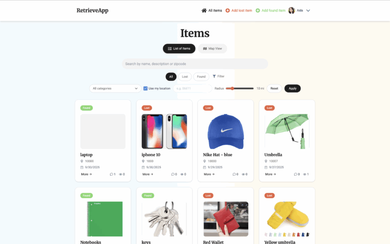 RetrieveApp is a community-driven lost & found platform that helps people quickly recover lost belongings in shared and public places. Users can create posts about lost or found items, upload photos, and view everything on an interactive map. Community members can mark “seen it”, message the owner, or leave comments to help return items faster.