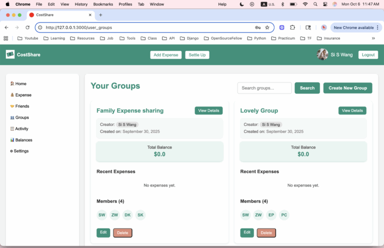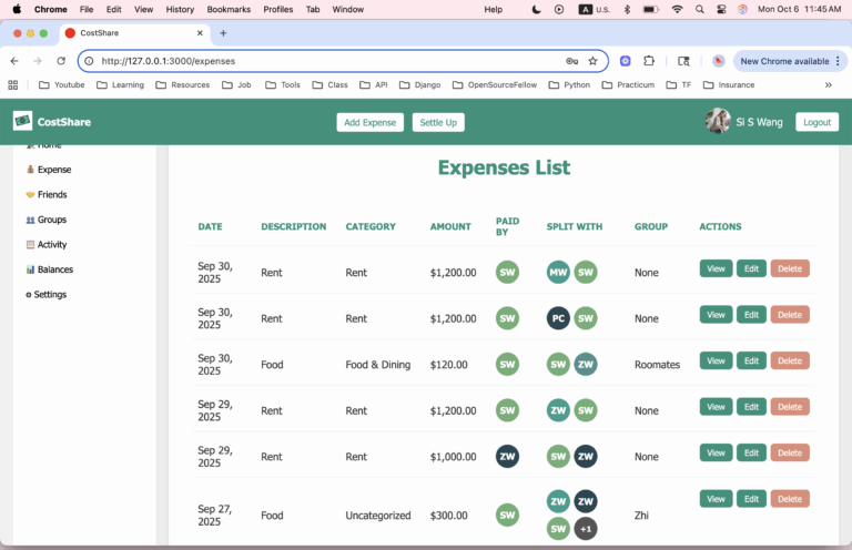 "CostShare" Aims to simplify expense sharing among friends or groups by allowing users to track, split, and settle shared costs easily. Core features include secure user authentication, the ability to add friends and create groups, and comprehensive expense management tools.