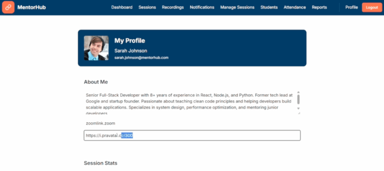 MentorHub is an all-in-one mentorship management platform that streamlines how students and mentors connect, schedule, and track progress. It replaces fragmented communication and manual scheduling with automated session management, real-time analytics, and role-based dashboards — empowering mentors to focus on teaching while helping students easily access and engage in consistent learning opportunities.