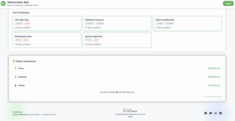 PeerQuests is a fun, social platform that helps people stay motivated by building habits together through shared challenges.