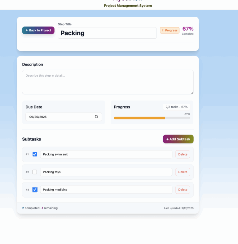 Project Management System "MycelFlow" – a comprehensive web application that helps teams organize, track, and manage event projects efficiently. Users can create projects, break them down into manageable steps with subtasks, set deadlines, upload project images, and monitor progress in real-time.