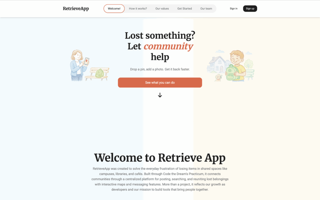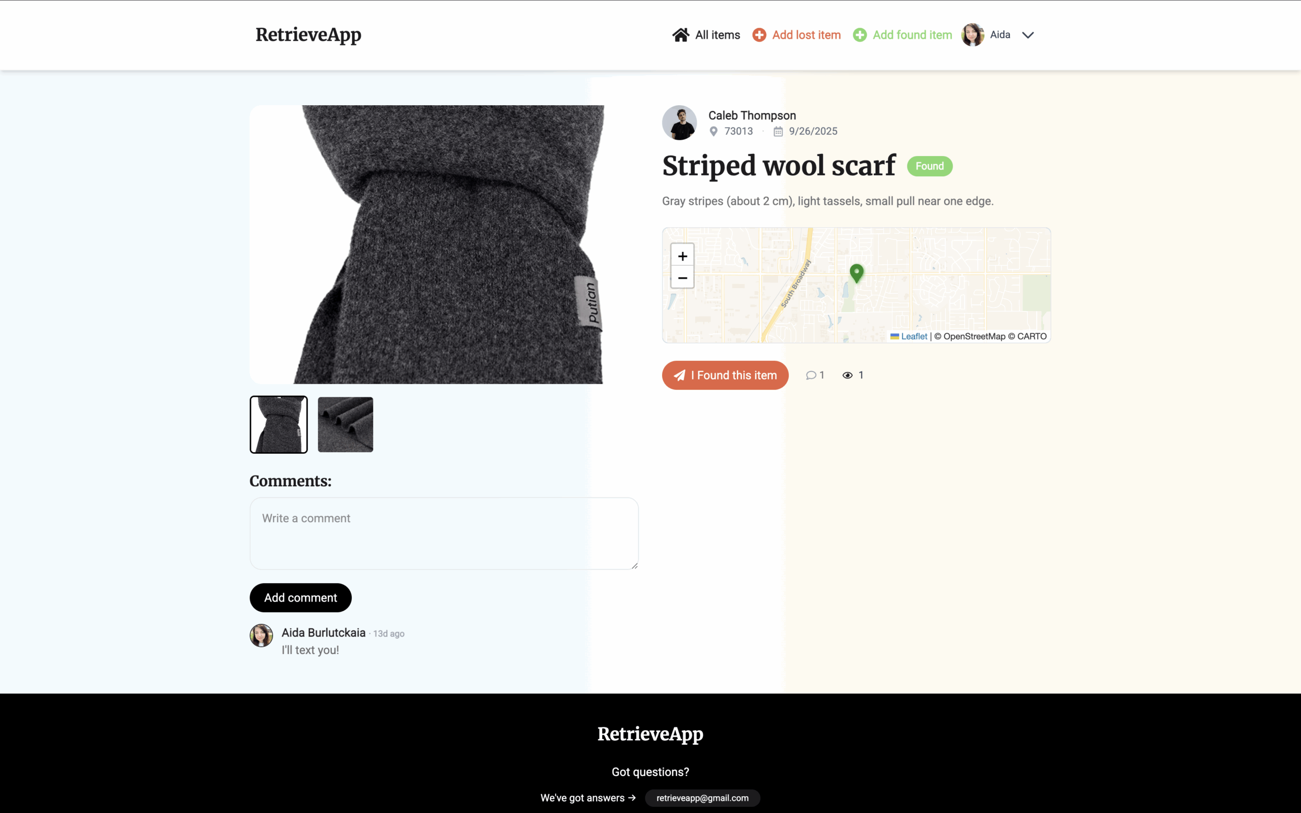 RetrieveApp is a community-driven lost & found platform that helps people quickly recover lost belongings in shared and public places. Users can create posts about lost or found items, upload photos, and view everything on an interactive map. Community members can mark “seen it”, message the owner, or leave comments to help return items faster.
