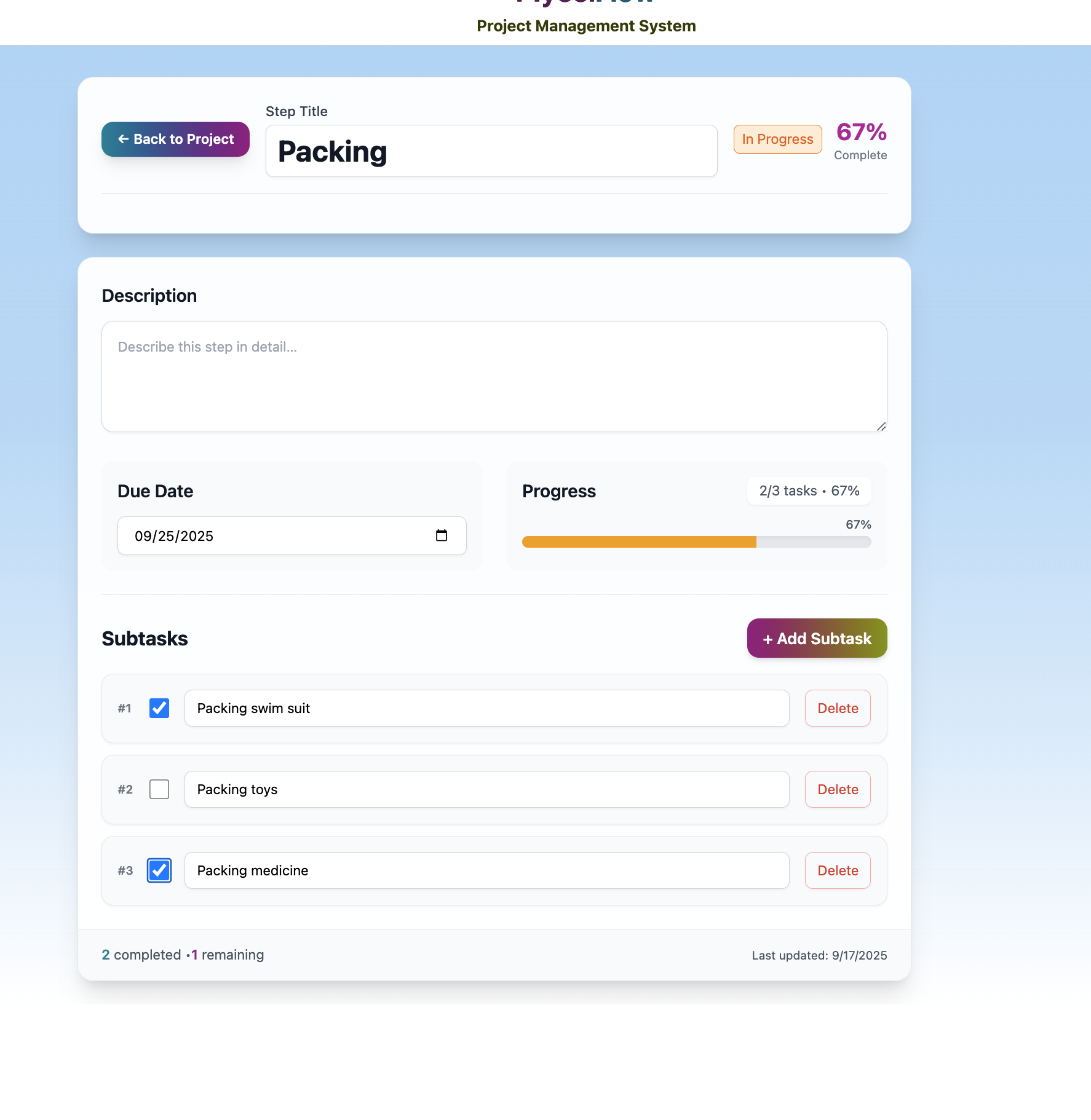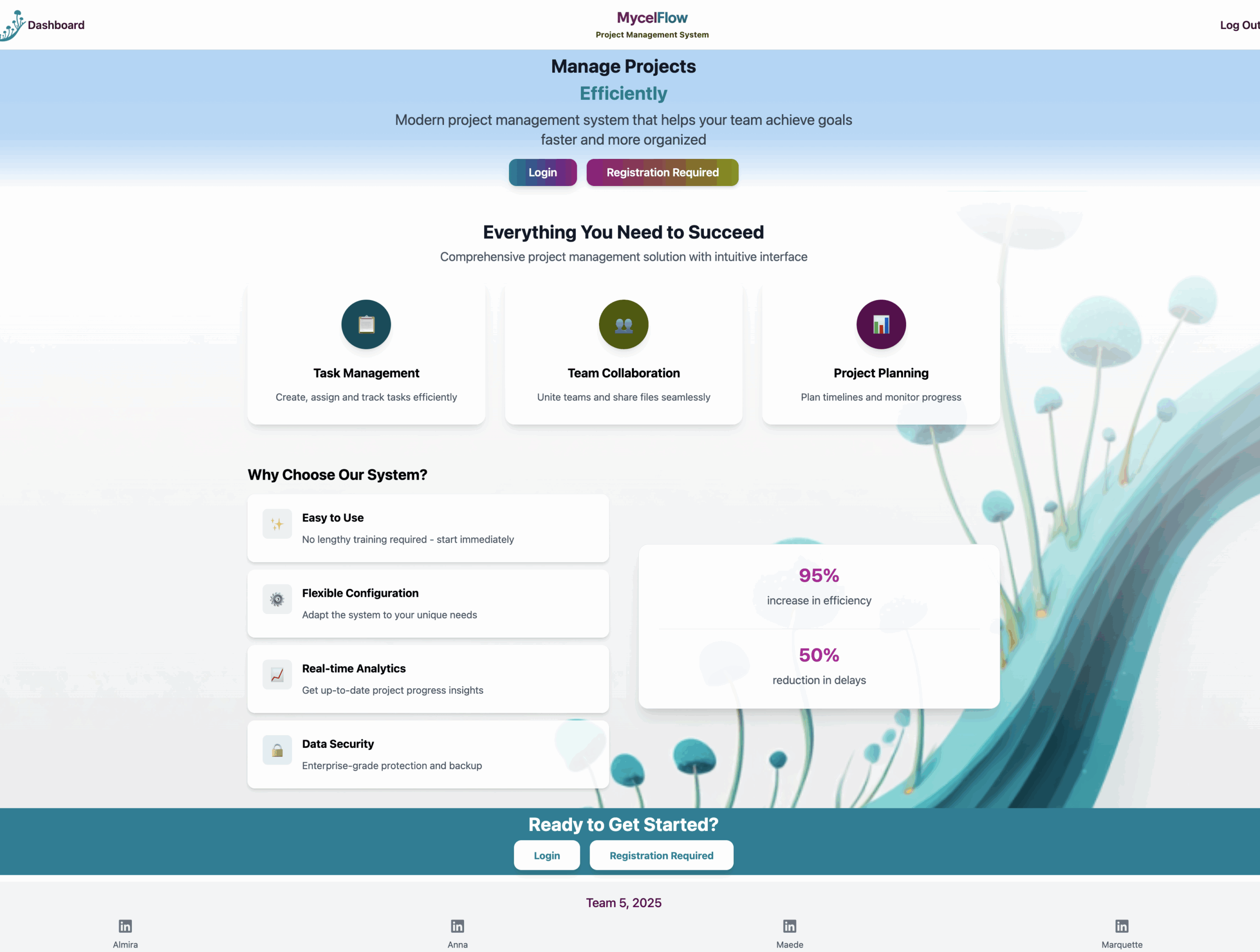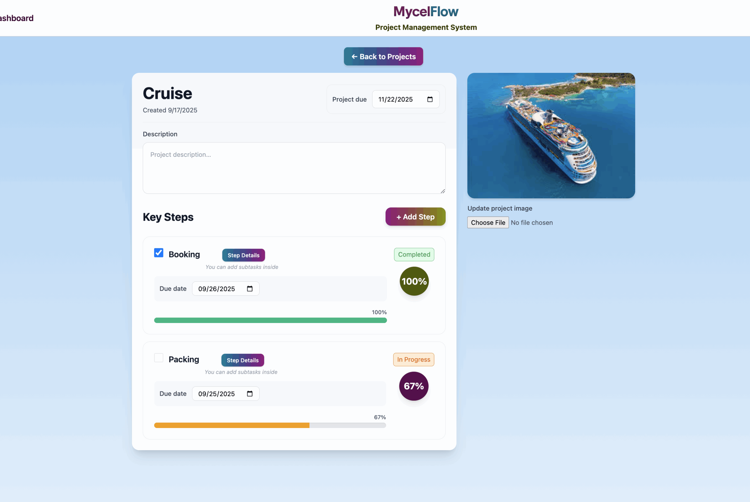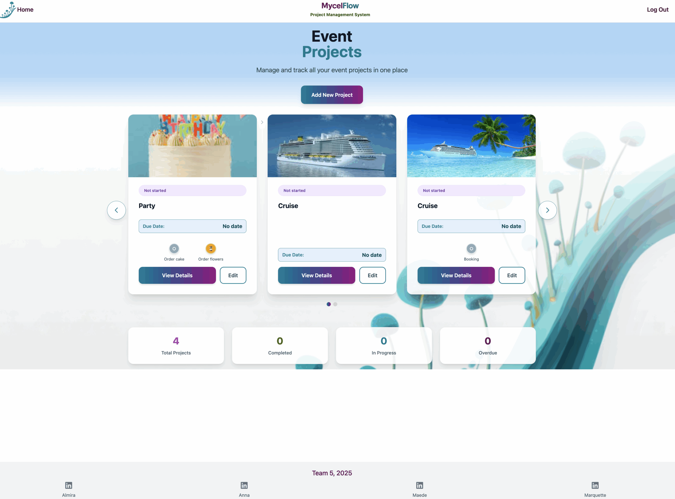 Project Management System "MycelFlow" – a comprehensive web application that helps teams organize, track, and manage event projects efficiently. Users can create projects, break them down into manageable steps with subtasks, set deadlines, upload project images, and monitor progress in real-time.
