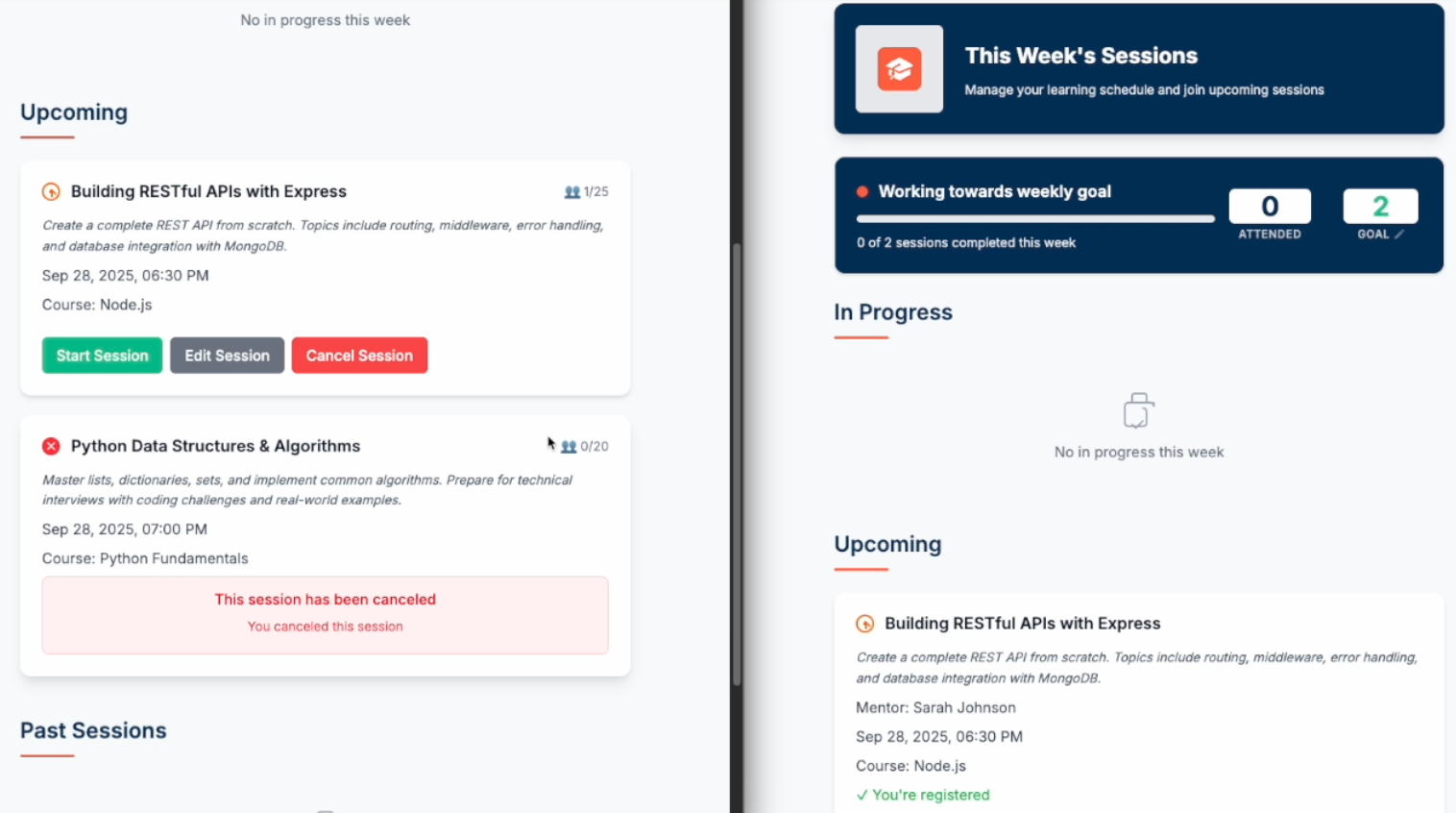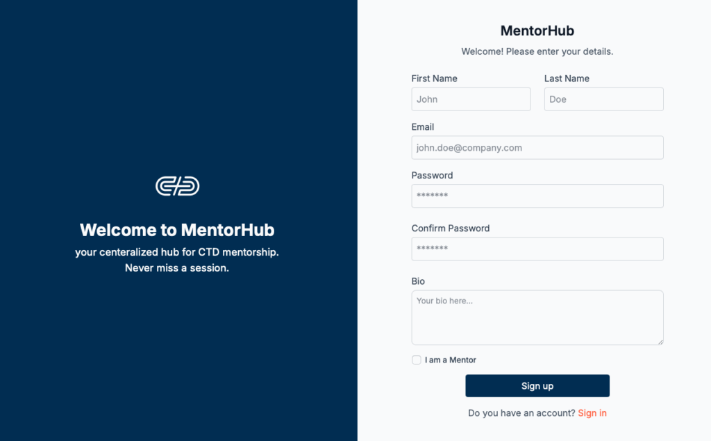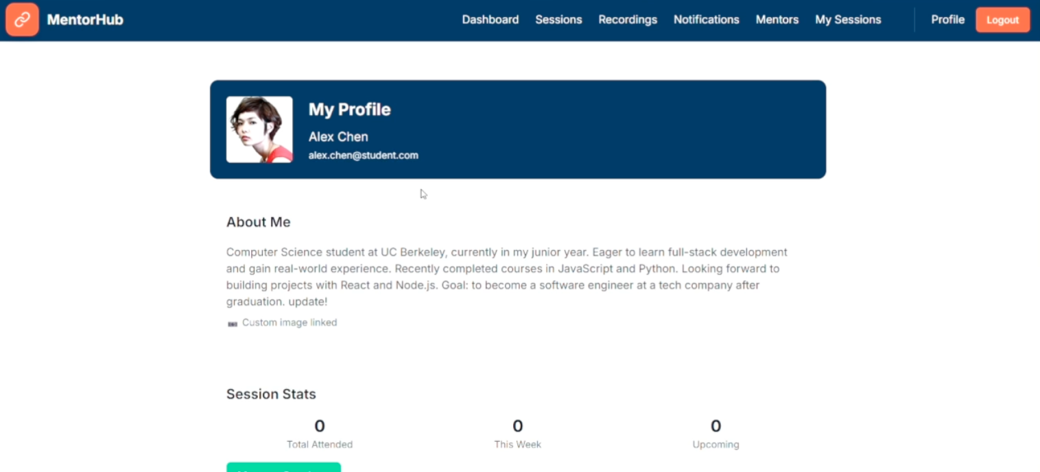 MentorHub is an all-in-one mentorship management platform that streamlines how students and mentors connect, schedule, and track progress. It replaces fragmented communication and manual scheduling with automated session management, real-time analytics, and role-based dashboards — empowering mentors to focus on teaching while helping students easily access and engage in consistent learning opportunities.